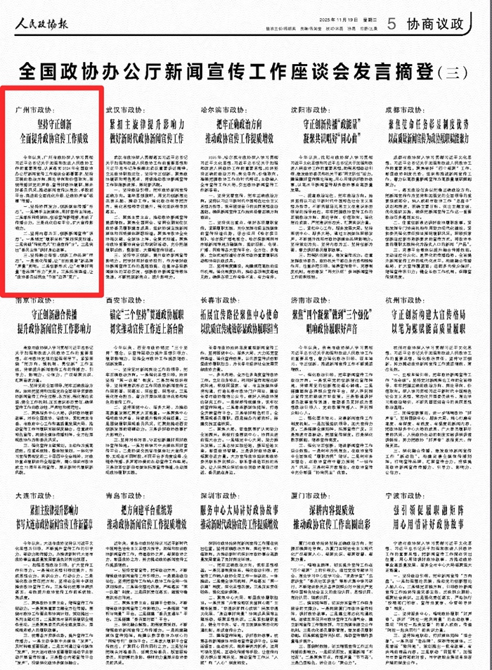 《人民政协报》:全国政协办公厅新闻宣传工作座谈会发言摘登——【广州市政协】坚持守正创新 全面提升政协宣传工作质效