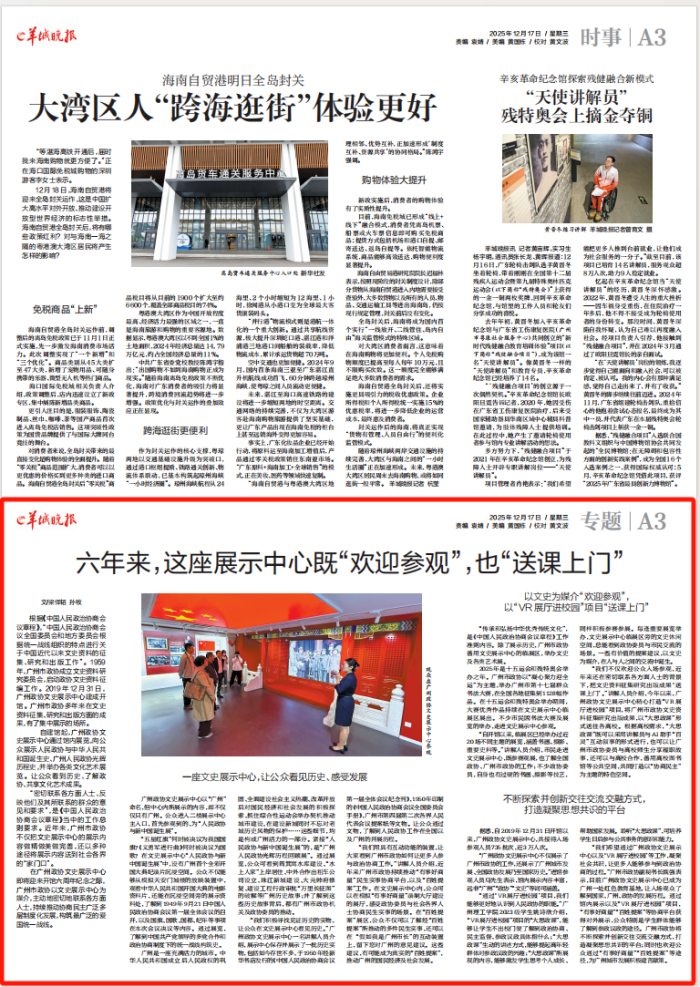 “我们不仅欢迎公众入场参观,近年来还在密切联系各方面人士的背景下,把文史资料征集研究出版成果‘送课上门’。”讲解人员介绍,今年以来,广州政协文史展示中心精心打造“VR展厅进校园”项目,将广州市政协文史资料征集研究出版成果,以“大思政课”形式送往各高校。根据高校需求,“大思政课”既可以采用讲解员与AI助手“百灵”互动叙事的形式进行,也可以让广州市政协委员与高校师生分享履职故事,还可以与高校合作,善用高校图书馆等公共空间,共同打造以“协商民主”为主题的特色空间。