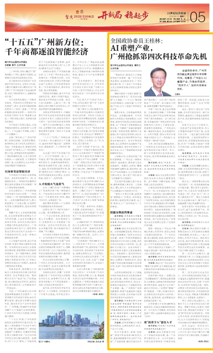 编者按:3月10日,《21世纪经济报道》刊登了《全国政协委员王桂林:AI重塑产业,广州抢抓第四次科技革命先机》一文。王桂林围绕科技创新、产业升级、人才引育等领域结合广州实际提出建议。现转载相关内容,以飨读者。