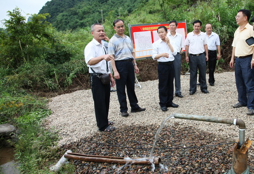 在饮水工程取水点,苏志佳主席详细听取连州镇有关负责同志对工程情况的介绍