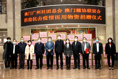 2月21日下午,澳门广州社团总会、澳门穗协联谊会捐助抗击新型冠状病毒肺炎疫情物资捐赠仪式在广州市政协办公大楼举行。