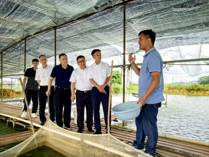 在五联村德权渔业公司,调研组参观了鱼苗繁殖基地,了解企业农业科技创新和经营发展情况。听取中新镇推进“百千万工程”第二批典型村建设情况的汇报。