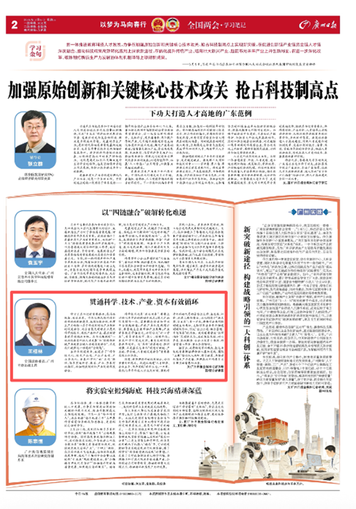 编者按:3月6日,《广州日报》A2版刊登了《贯通科学、技术、产业、资本有效循环》一文,全国政协委员、广州市政协副主席王桂林立足科技创新一线发表学习感想。现转载相关内容,以飨读者。