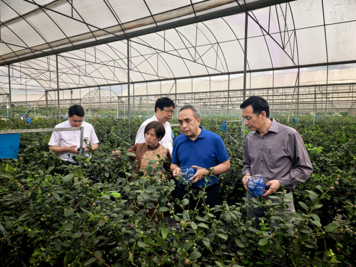 调研组首先来到中植五星蓝莓基地,实地察看了数控大棚、5G智控无土栽培系统和水肥一体化智控设施,详细了解基地在智能化精准肥水管理、环境实时监测、手机端远程操控等方面的技术应用。随后,调研组前往中植总部大楼,参观组培室,了解蓝莓等种苗繁育技术及年育苗能力。企业负责人介绍了设施栽培模式、“国企+民企”合作运营经验,以及品牌建设和蓝莓深加工发展情况。